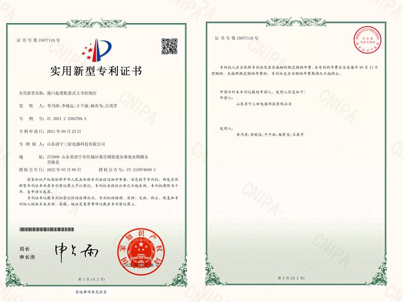港口起重機(jī)盤式主令控制臺(tái)專利證書