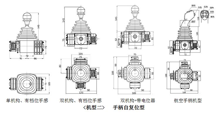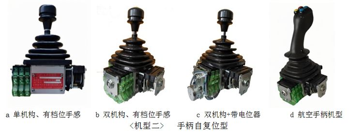機型二:手柄自復(fù)位。細分有三種結(jié)構(gòu)形式:1).手柄自復(fù)位、有檔位手感 2)手柄自復(fù)位+帶電位器 3).航空手柄自復(fù)位