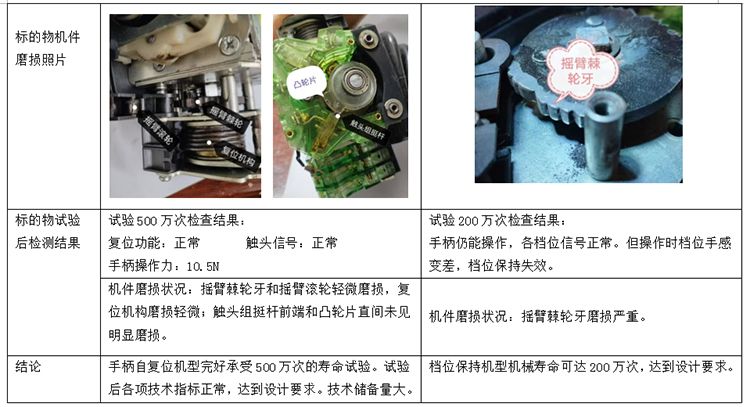 操縱桿防塵罩已徹底壞掉,檢查發(fā)現(xiàn)末檔無電器開關(guān)量信號,拆解發(fā)現(xiàn)是觸點壞掉。另外還發(fā)現(xiàn),三檔凸輪片因與棘輪檔位不同步,因觸點在檔位上無信號,工人裝配時,對凸輪片角度進行了修理。凸輪片上被裝配工修挫的痕跡還明顯存在。這說明產(chǎn)品棘輪檔位和凸輪片相對應(yīng)的工作部位同步性達不到要求,所以需要裝配時,工人現(xiàn)場修銼。據(jù)用戶講,該機被拆下來時,在焦化廠的煤焦車上已用了2年多的時間,這也到了其使用壽命。觸頭組有三種不同的規(guī)格,但均為橋式雙斷點。凸輪片為扇形(2mm厚),緊密套裝在凸輪軸上。因凸輪片太薄,觸頭組的動觸橋頂桿前端與凸輪片接觸應(yīng)力偏大,造成不耐磨,其電壽命估計在150萬次左右,和用戶告知的使用年限基本相吻合。此操縱桿觸頭組屬于易損件,有快換拆卸結(jié)構(gòu)。另外,棘輪檔位控制和保檔機構(gòu)十分可靠,這是個亮點設(shè)計。