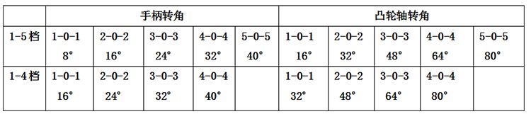 (3).檔位選定:XKDF檔位有1-5檔,手柄轉(zhuǎn)角1-0-1 12°;2-0-2 18°;3-0-3 24°;4-0-4 30°;5-0-5 36°.齒輪付增速比i=3.25,與手柄轉(zhuǎn)角對(duì)應(yīng)的凸輪軸轉(zhuǎn)角(凸輪軸裝有凸輪片)為:39°,58.5°,78°,97.5°,117°。