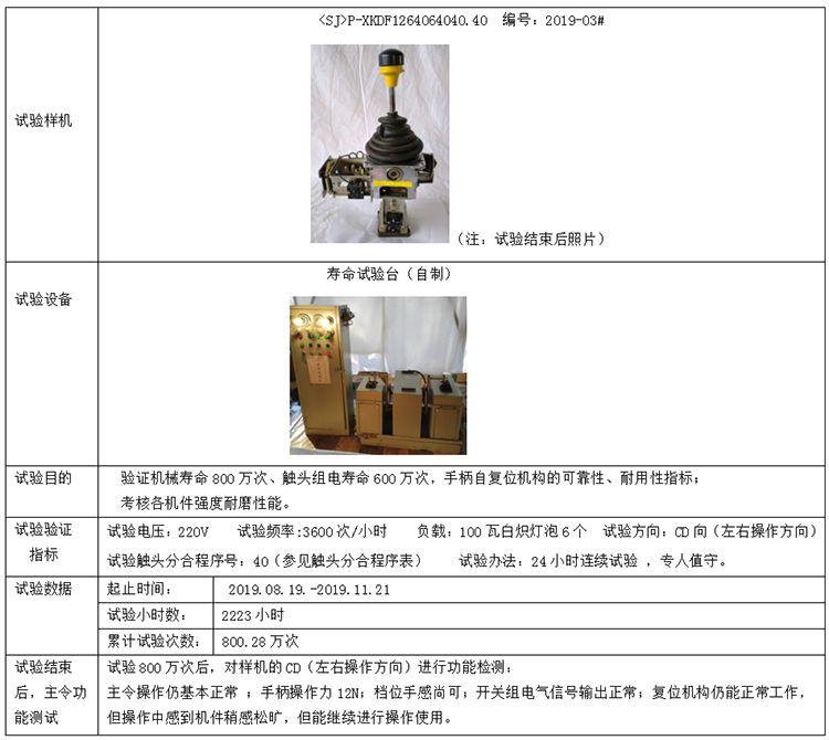 為了驗(yàn)證批量生產(chǎn)的產(chǎn)品質(zhì)量的可靠性、機(jī)械壽命、電氣壽命是否達(dá)到設(shè)計(jì)指標(biāo),從批量生產(chǎn)的產(chǎn)品中隨機(jī)抽樣一臺(tái),對(duì)其進(jìn)行800萬(wàn)次的臺(tái)架機(jī)械壽命和電氣壽命試驗(yàn)。