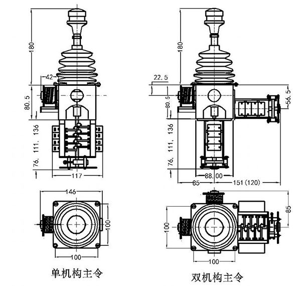 雙機(jī)構(gòu)控制器,操作兩個(gè)凸輪軸開(kāi)關(guān),手柄分為聯(lián)動(dòng)操作,用AK表示和“十”字形操作,用KK表示。